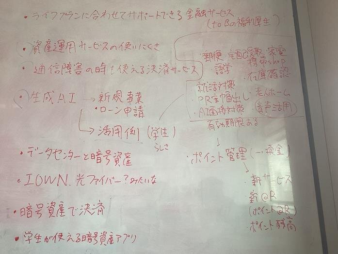 学生たちはディスカッションを重ね、日常で感じている金融サービスの不便さや、「もっとこうだったらいいのに」という思いを言葉にしていきました。