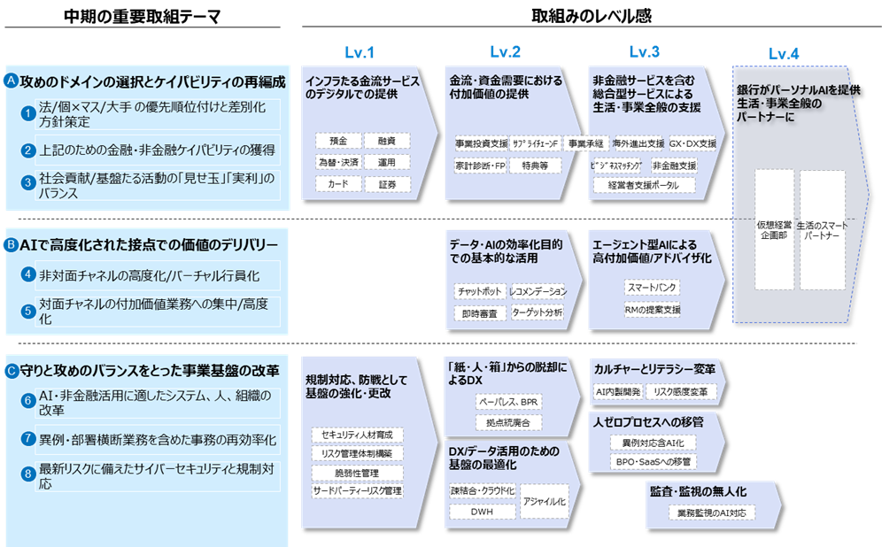 中期テーマは三つに整理されます。第一に「攻めのドメイン選択」。自行が勝てる市場を見極め、金融・非金融のケイパビリティを再編し、差別化を図ることです。第二に「AIによる接点の高度化」。非対面チャネルの効率化だけでなく、対面チャネルを高付加価値業務へ集中させ、接点そのものを高度化することが求められます。第三に「攻守を両立する事業基盤の改革」。セキュリティや事務の堅牢化(守り)と、AI活用に適した組織・基盤への転換(攻め)を同時に進める必要があります。