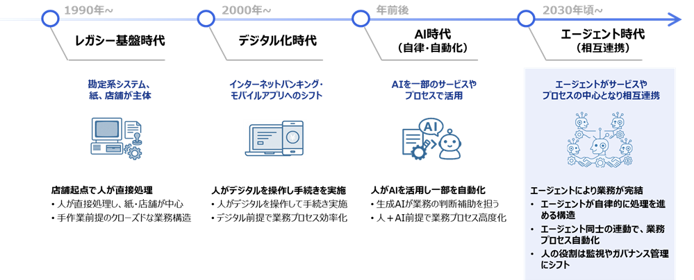 そして2030年代に向けて見えているのが、エージェントがサービスや業務プロセスの中心となる「エージェント時代」です。エージェント同士が連携しながら自律的に処理を進めることで、業務は人を介さず完結し、人の役割は監視やガバナンスへとシフトしていきます。こうした構造変化により、銀行の在り方そのものが大きく変わっていくことが想定されます。