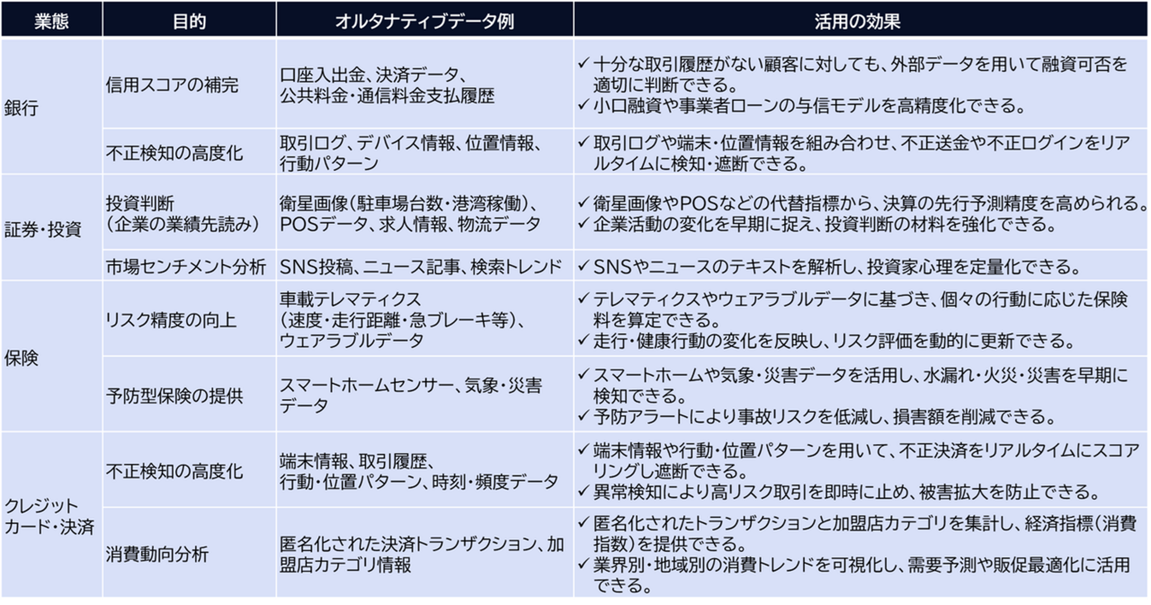 実際に、金融業界では、従来の財務データに加え、購買・支払履歴、衛星画像、SNS、スマートデバイス情報などのオルタナティブデータ活用が進んでいます。多様な外部データを組み合わせることで、より高度な意思決定とリスク管理が可能とになりつつあります。