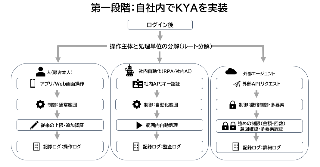第一段階は、自社の範囲の中でKYAを実装し、ログイン後の操作について「誰の手によるものか」を分解して記録し、ルートごとに実行権限を出し分ける取り組みです。これはpKYCやAML、不正対策と同じく、リスク管理の延長として進められます。どの操作を、どの条件で委任するかを明確にし、その範囲外はブロックや追加確認の対象にする設計が必要です。