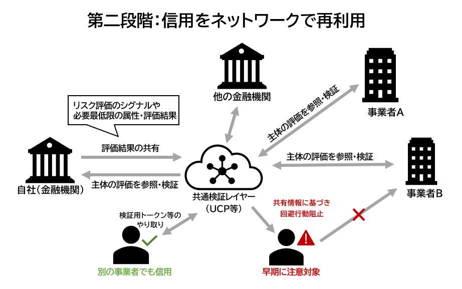 ・具体:主体ごとにトークンやパスポートのような検証手段を用意し、必要に応じて検証情報を照会できる仕組みを整えるイメージです。照会の対象は、IDそのものではなく、リスク評価のシグナルや必要最小限の属性・評価結果に寄せます。これが機能すれば、クリーンな履歴を積み重ねた主体は別の事業者でも一定の信用として扱いやすくなり、逆に不審と判断された主体は早い段階から注意対象として認識されやすくなります。