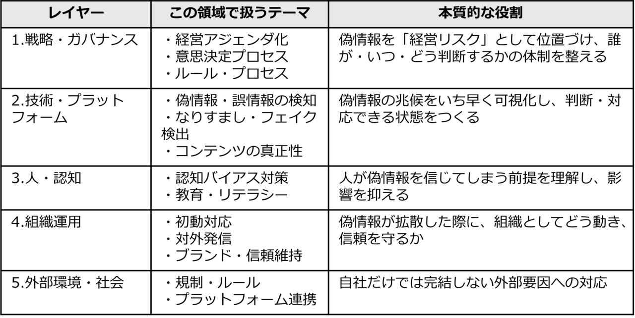 こうした背景を踏まえ、本稿では偽情報セキュリティを複数のレイヤーで整理しました(表2)。この表は、偽情報への対応が単なる技術課題ではなく、組織全体の問題であることを示しています。