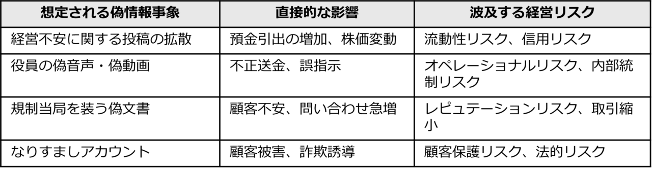 金融機関においては、偽情報が単なる評判問題にとどまらず、信用リスク、流動性リスク、オペレーショナルリスクへと転化し得る構造を持っています。その関係を整理すると、次のとおりです。