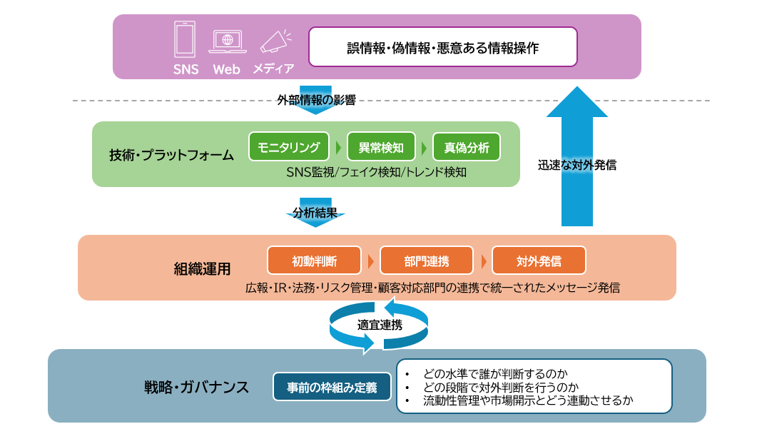 したがって、設計の出発点としてまず必要なのは、偽情報を広報課題ではなく経営リスクとして位置づける戦略・ガバナンスの整備です。どの水準で誰が判断するのか、どの段階で対外発信を行うのか、流動性管理や市場開示とどう連動させるのかといった枠組みを事前に定義しておくことが不可欠です。